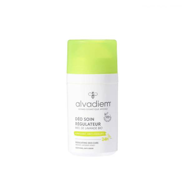 Deodorant soin régulateur 24h 40ml Alvadiem à base de miel de lavande bio offrant une protection naturelle et durable pendant 24 heures contre les mauvaises odeurs tout en respectant l’équilibre cutané. Sa formule sans sels d’aluminium et sans alcool est conçue pour les aisselles sensibles, même après le rasage ou l’épilation. Enrichi en miel de lavande bio de Provence, reconnu pour ses propriétés antibactériennes naturelles, il aide à limiter la prolifération des bactéries responsables des odeurs corporelles tout en purifiant la peau. Les prébiotiques d’origine végétale renforcent l’équilibre du microbiote cutané.