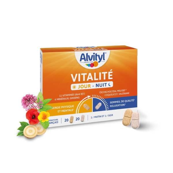 20 comprimés jour + 20 comprimés Vitalité nuit Alvityl est un complément alimentaire pouvant aider à combattre la fatigue et le manque de vitalité, qu’elle soit passagère ou plus durable. Sa formule associe 11 vitamines, 6 minéraux et plusieurs plantes pour soutenir l’énergie et le bien-être tout au long de la journée et favoriser un sommeil réparateur la nuit. Le comprimé « Jour » stimule les performances physiques et intellectuelles grâce aux vitamines B, C, E, au fer et au ginseng, tandis que le comprimé « Nuit » favorise l’endormissement et améliore la qualité du sommeil grâce à des plantes reconnues comme la valériane, la mélisse, l’eschscholtzia et le coquelicot.