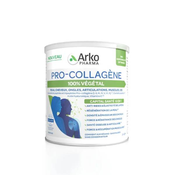 Pro-collagène 100% végétal capital santé 6en1 231g Arkopharma est un complément alimentaire conçu pour régénérer et renforcer tous les tissus structurels du corps. Sa formule 100% végétale, enrichie en peptides et tripeptides biomimétiques, stimule la production des principaux types de collagène (I, II, III, IV, V, VI, X) dans l’organisme. Ultra-assimilable et hautement dosé en hydroxyproline, cet actif breveté contribue à améliorer l’élasticité cutanée, la densité et l’épaisseur des cheveux, la force et la résistance des ongles, et soutient la masse musculaire pour préserver sa force et favoriser la récupération.