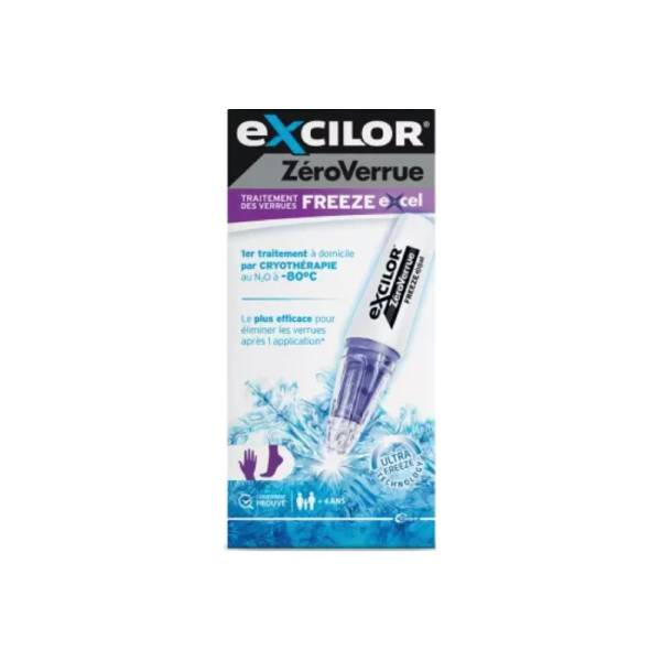 Zéro verrue freeze excel Excilor est un dispositif de cryothérapie destiné à l’élimination des verrues des mains et des pieds. Grâce à sa technologie à base de protoxyde d’azote, il gèle la verrue jusqu’à –80 °C afin d’atteindre son cœur et de détruire le tissu verruqueux en profondeur. L’action rapide du froid permet une chute naturelle de la verrue au fil du renouvellement cutané, avec des résultats souvent visibles dès le premier traitement. Son format stylo avec embouts jetables assure une application précise, hygiénique et sécurisée à domicile.