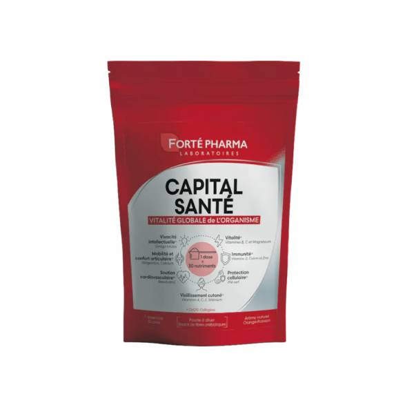 Capital santé vitalité globale de l'organisme 228g Forté Pharma est un complément alimentaire conçu pour soutenir la vitalité globale de l'organisme. En une seule dose par jour, il apporte un concentré de 30 nutriments essentiels agissant sur l’énergie physique, la vitalité intellectuelle, les défenses immunitaires, la circulation sanguine et la santé cardiovasculaire. Il contribue également au bon fonctionnement des muscles, tendons et articulations, protège les cellules du stress oxydatif et participe à l’éclat et au tonus de la peau. Sa formule intègre de l’inuline prébiotique pour soutenir l’équilibre digestif et faciliter l’assimilation des nutriments.