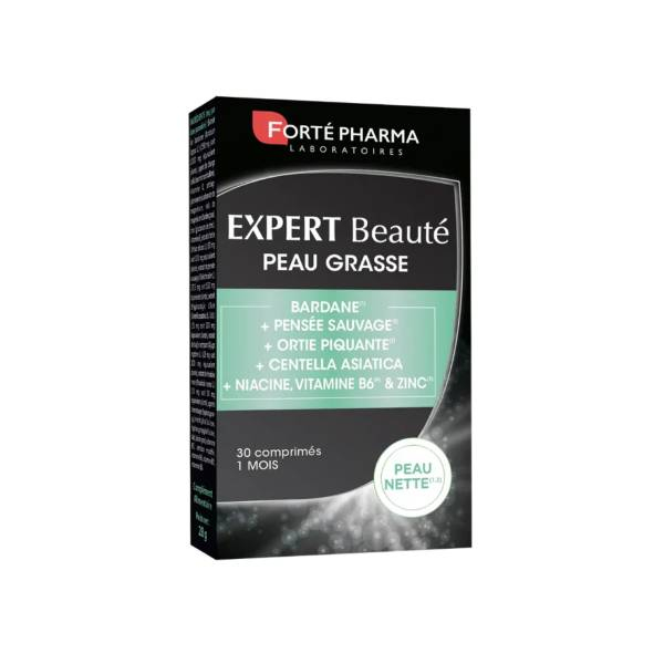 30 comprimés Expert beauté peau grasse Forté Pharma est un complément alimentaire formulé pour soutenir les peaux à tendance grasse et sujettes aux imperfections. Il associe des plantes reconnues pour leurs propriétés purifiantes, telles que la Bardane, la Pensée sauvage et l’Ortie, afin de favoriser une peau nette et saine. La formule est enrichie en zinc, qui contribue au maintien d’une peau normale, ainsi qu’en vitamines B2, B3, B6, B8, C et E pour réguler l’activité hormonale et apporter un effet antioxydant. Ce complément aide à rééquilibrer la peau, réduire les brillances et limiter l’apparition des imperfections.