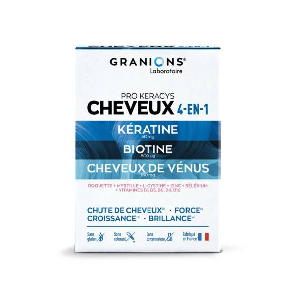 90 comprimés Pro keracys cheveux kératine 1000mg Granions est un complément alimentaire pouvant renforcer la beauté et la vitalité des cheveux. Il associe des actif pouvant agir simultanément sur 4 axes essentiels : la prévention de la chute, la stimulation de la croissance, la fortification de la fibre capillaire et l’illumination de la chevelure. Sa formule innovante réunit la kératine, la L-cystine, la biotine, le zinc et la vitamine B6, reconnus pour leur rôle clé dans la santé du cheveu. Enrichi en extraits naturels de roquette, de myrtille et de cheveux de Vénus, ce complexe contribue à améliorer la densité capillaire, renforcer la tige du cheveu et redonner éclat et brillance. Grâce à son apport en huile de carthame riche en acides gras essentiels, les cheveux retrouvent douceur et luminosité, tandis que la microcirculation du cuir chevelu est stimulée pour favoriser une repousse plus dense et vigoureuse.