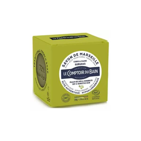 Savon de Marseille surgras olive authentique solide 200g Le Comptoir du Bain est un savon solide fabriqué à l’ancienne, enrichi en huile d’olive et composé à 99 % d’ingrédients d’origine naturelle. Sa formule surgras nettoie en douceur tout en préservant l’hydratation et le confort de la peau. Sans parfum ni huile de palme, il est testé sous contrôle dermatologique et certifié Cosmos Natural par Ecocert Greenlife. Ce savon écologique offre une alternative durable aux gels douche classiques, avec une longévité équivalente à 200 lavages.