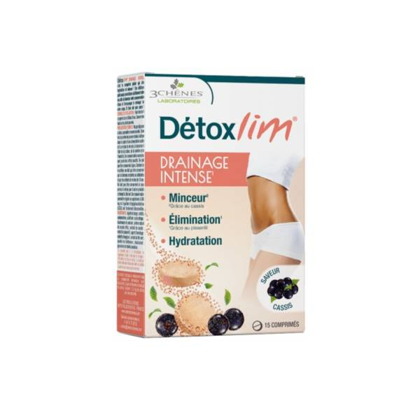 15 comprimés effervescents drainage intense cassis Détoxlim Les 3 Chênes est un complément alimentaire sous forme de comprimés effervescents, conçu pour favoriser le drainage de l’organisme tout en facilitant l’hydratation quotidienne. Grâce à une association de plantes et d’extraits de fruits, ces pastilles aromatisent agréablement l’eau sans sucres ajoutés, offrant une alternative saine aux boissons sucrées. Elles transforment l’eau en une boisson rafraîchissante tout en soutenant les fonctions d’élimination naturelles du corps.