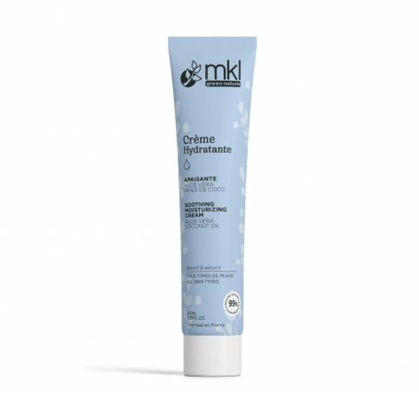 Crème hydratante apaisante bio 40ml MKL Green Nature est le soin quotidien idéal pour les peaux en manque de confort. Formulée avec 99% d’ingrédients d’origine naturelle, elle associe l’Aloe Vera bio, l’huile de coco bio et le calendula bio pour nourrir, adoucir et apaiser la peau jour après jour. Sa texture veloutée et légère pénètre rapidement, sans laisser de film gras, tout en enveloppant la peau d’un parfum délicat aux notes fraîches et réconfortantes. Grâce au complexe breveté Aquaxyl™, elle stimule l’hydratation naturelle de la peau et aide à maintenir l’équilibre hydrique cutané.