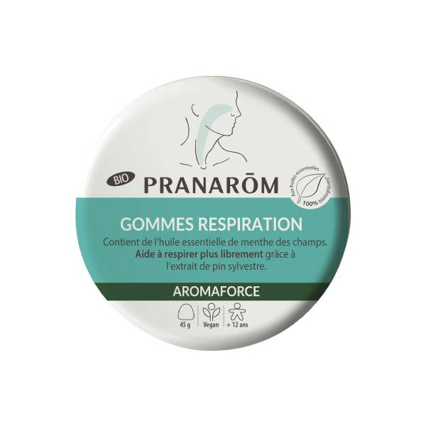 Aromaforce gommes respiration bio 45g Pranarôm sont formulées à base d’huiles essentielles 100 % biologiques pour favoriser une respiration plus libre en cas de nez encombré. Leur composition naturelle associe les huiles essentielles de menthe des champs et d’eucalyptus globuleux à des extraits de pin sylvestre et de thym vulgaire, reconnus pour leurs propriétés rafraîchissantes et apaisantes sur les voies respiratoires. Leur goût agréable et leur format pratique permettent une prise facile tout au long de la journée, tout en procurant une sensation de fraîcheur et de confort respiratoire.