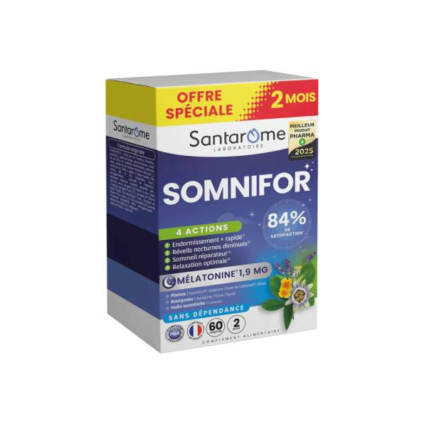60 comprimés Somnifor Santarome est un complément alimentaire aidant à retrouver un sommeil réparateur. La formule associe mélatonine, plantes apaisantes, huile essentielle et bourgeons frais pour agir sur toutes les étapes du sommeil. Grâce à la mélatonine, Somnifor 4 Actions réduit potentiellement le temps d’endormissement et atténue les effets du décalage horaire. La valériane, la passiflore et le pavot de Californie favorisent un sommeil profond et réparateur.